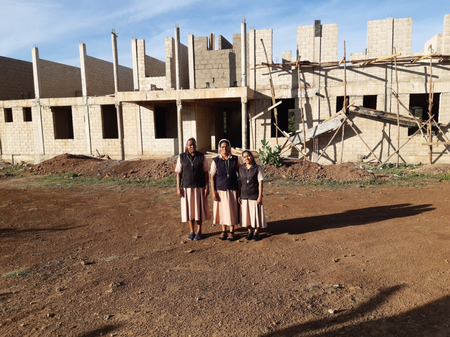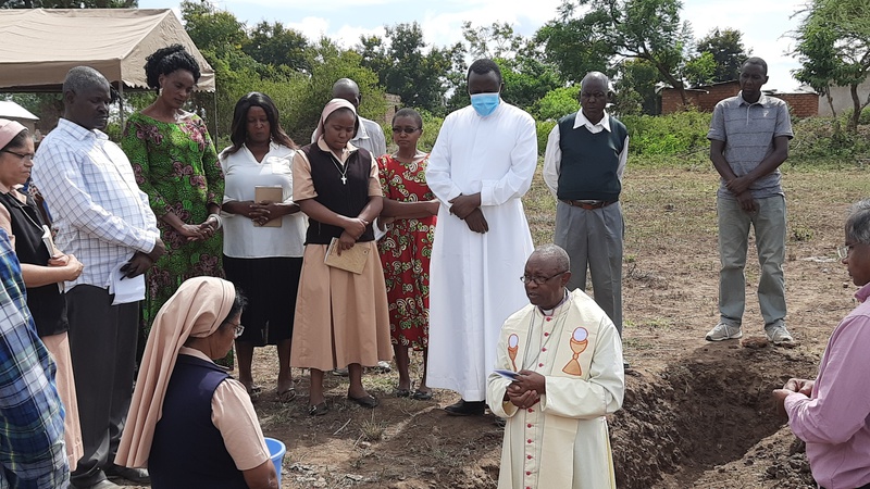Nachdem alle Genehmigungen erteilt waren, haben die Schwestern am 27. März 2021 mit der Grundsteinlegung und Segnung der Baustelle durch Bischof Isaac Amani und dem Bau des Kinderheimes begonnen.